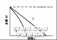图3 颗粒沉降轨迹1-离散颗粒 2-絮凝颗粒悬浮颗粒沉降过程中,絮凝颗粒之间互相碰撞、聚集,改变了颗粒原来的大小、形状及密度,颗粒沉降速度也随之改变。在沉淀池中颗粒沉降轨迹是一条曲线,其去除率不仅同截留速度有关,还与沉降时间有关。二沉池污泥、混合污泥及高浊度废水在沉淀池中的沉降特性,如图1所示。即沉降开始后,立即出现清水层A,它与下面的悬浮B(浑液面)之间有一个明显的界面,在图中表示为1-1面。悬浮层B为受阻沉降层,该层内浓度均匀,在形成1-1面的同时,沉淀池底部出现密实层D,其中悬浮物浓度也是均匀的;B层与D层之间是过渡层C,其悬浮物浓度由上向下逐渐增加,C与D层之间分界面称为2-2面。1-1面以vs速度下降,2-2面以v速度上升,从沉降开始,历时t2后,两个面相遇,C层消失。此时D层浓度变为C,处于临界浓度,此时D层开始压缩。