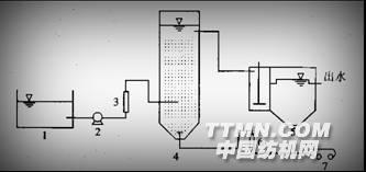 1:调节池 2:原水泵 3:流量计 4WL40A2H反应器 5:过滤池 6:空气流量计 7:鼓风机2、流程说明生产线排出的废水,通过厂区污水管道,汇集到安装有粗细二道格栅的调节池,去除大颗粒的固体悬浮物,并调节废水水量、均衡水质。然后由一级提升泵提升至复级离子混合反应器,经物理沉淀、化学断链、单键破坏、生物降解、光崔化氧化等过程达到脱色混凝沉淀、氧化还原等机理脱除废水中的污染物质。其出水提升到物理过滤池过滤后,自流到清水池经计量后,备工艺回用或排放,排放水达到国家排放标谁。复级离子反应器产生的废污泥都排入污泥干化池重力澄清后(约需30分钟)排出清液,沉淀污泥混入然料然烧(其热值不低于2300大卡)。