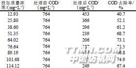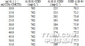 注: 被处理废水的pH 为5.0, CTA- CMCTS 在废水中的质量浓度为51.35 mg/L。由表5 可看出, 皂土与CTA- CMCTS 复配比的增加会提高混凝剂对印染废水COD