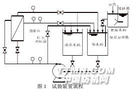 1试验部分 1.1试验材料 试验所用的膜为PVDF材料的国产自制平板式 超滤膜,截留分子质量为140 000 D alt on。试验所用 废水为浙江某印染厂实际工业废水,经前置生化法 处理后,其二级出水COD为250 mg·L-1,pH为 7.06,浊度57.53 NTU。该指标未达到我国纺织染整 工业水污染物排放标准中的一级标准,且明显有黑 色混浊物,未经进一步处理不可直接排入江河水体, 更无法满足工业生产回用要求。 1.2试验装置 试验所用装置为自行设计的超滤系统,其流程如 图1所示。将超滤膜放入膜组件,进水流道用橡皮圈 阻隔,高约3 mm,单页膜有效过滤面积为68.56 cm2。 系统可通过调节压力控制阀门,改变过程中的实际 操作压力。为确保进水水