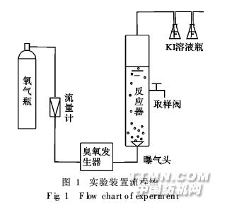 1 实验部分1.1 试剂与仪器浓硫酸、氢氧化钠、叔丁醇均为分析纯;所用废 水特征pH 7. 4, COD cr 96. 2 mg/L,UV2541. 020,色 度25倍。KT-OZ-3G臭氧发生器;雷磁PHS-3C精密pH 计;G10T8 UV灯(10W);紫外可见分光光度计。1.2 实验方法反应器为圆柱形,内径45 mm,高70 cm。以纯 氧作气源,经过臭氧发生器高压放电后得到臭氧和 氧气的混合气体,该混合气体通过硅胶管进入反应 器中,由砂芯曝气头进行布气。实验流程见图1。 除特殊说明外,所有实验均在下述条件下进行, 废水500 mL,进气流量为30 L/h,臭氧浓度 2. 70 mg/L,反应20 min,废水初始pH值为7. 4,UV 灯为10W。