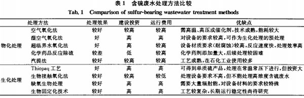 在处理方法的选择上,应针对不同性质的含硫废水,采用不同的处理工艺,工程中常常将不同的处理工艺联合使用。表1对几种常用及处于研究阶段的含硫废水处理方法进行了比较总结。