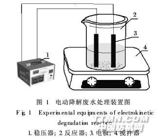 近年来,来自于印染纺织企业染料废水排放已 经对水域环境产生了严重的危害。调研证实,染料 废水主要来自于中、小型纺织、印染企业,因而其具 有分布相对分散、集中处理难以进行的特点。除此 之外,由于中、小型纺织、印染企业在染色工程中使 用大量的分散剂、媒染剂等助剂,使得染料废水的可 生化性明显降低。因此,探索和研究新型染料废水 处理技术是我国环境领域当前急需解决的难题 之一。目前,针对印染废水处理的研究主要集中在物 理吸附、化学试剂氧化、膜处理、光催化氧化以及微 生物降解处理等技术。孙德帅等[1-2]研究了粉煤灰 对活性染料、酸性染料、阳离子染料废水的吸附脱色 处理,效果很好,但吸附剂再生及其后处理有一定的 难度。Fenton试剂法可以较好的氧化某些特定的染 料,可局部的推广,但成本较高[3]。采用膜技术对 染料废水的脱色处理取得好的效果[4-5],但是国内在 膜技术的研究和应用上仍存在困难。生化分解法能 有效的分解废水中的有机高分子,但因为废水本身 的毒性,对微生物有杀伤作用,这也抑制了该方法取 得更佳的效果[6]。光催化氧化法和超声降解技术 则还处在研究初期,但前景被普遍看好[7]。总而言 之,针对染料废水的毒物种类多、色度高、污染大的 特点,开发和研究新的染料废水处理途径在当前还 是具有鲜明的理论价值和应用意义[8-9]。 本研究旨在开发利用电动降解技术来处理酸性品红废水。实验主要考察电动降解技术处理酸性品 红废水的工艺条件,分析降解的机理等。