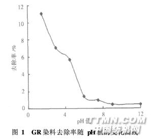 2 结果分析2.1 单因素分析(1)pH值(如图1)。GR染料的去除率随着pH值的升高 而降低, pH=12时去除率仅为0. 47%, pH=1. 5时去除率为 11. 06%。产生这种现象的原因为:①HO·具有强氧化性,在 光催化氧化反应中起主要作用;②