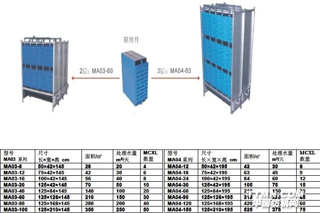 MicroClear®超滤膜组件可以有非常多的组合方式,既可以并排也可以重叠地堆放。MA03系列组件(膜元件的两层堆放)是为较浅的反应池设计的(水深1.8米),例如集装箱反应池。如果反应池比较深(水深超过 2.3米)最适合采用MA04系列。膜元件三层堆放,优点是所需空间小,曝气更有效率。