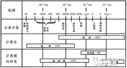 超滤与微滤分离范围比较 在水处理领域中,超滤技术可以除去水中的细菌、病毒、热源和其它胶体物质,因此用于制取电子工业超纯水、医药工业中的注射剂、各种工业用水的净化以及饮用水的净化。在食品工业中,乳制品、果汁、酒、调味品等生产中逐步采用超滤技术,如牛奶或乳清中蛋白和低分子量的乳糖与水的分离,果汁澄清和去菌消毒,酒中有色蛋白、多糖及其它胶体杂质的去除等,酱油、醋中细菌的脱除,较传统方法显示出经济、可靠、保证质量等优点。在医药和生物化工生产中,常需要对热敏性物质进行分离提纯,超滤技术对此显示其突出的优点。用超滤来分离浓缩生物活性物(如酶、病毒、核酸、特殊蛋白等)是相当合适的从动、植物中提取的药物(如生物碱、荷尔蒙等),其提取液中常有大分子或固体物质,很多情况下可以用超滤来分离,使产品质量得到提高。在废水处理领域,超滤技术用于电镀过程淋洗水的处理是成功的例子之一。在汽车和家具等金属制品的生产过程中,用电泳法将涂料沉积到金属表面上后,必需用清水将产品上吸着的电镀液洗掉。洗涤得到含涂料1~2%的淋洗废水,用超滤装置分离出清水,涂料得到浓缩后可以重新用于电涂,所得清水也可以直接用于清洗,即可实现水的循环使用。目前国内外大多数汽车工厂使用此法处理电涂淋洗水。超滤技术也可用于纺织厂废水处理。纺织厂退浆液中含有聚乙烯醇(PVA),用超滤装置回收PVA,清水回收使用,而浓缩后的PVA浓缩液可重新上浆使用。随着新型膜材料(功能高分子、无机材料)的开发,膜的耐温、耐压、耐溶剂性能得以大幅度提高,超滤技术在石油化工、化学工业以及更多的领域应用将更为广泛。