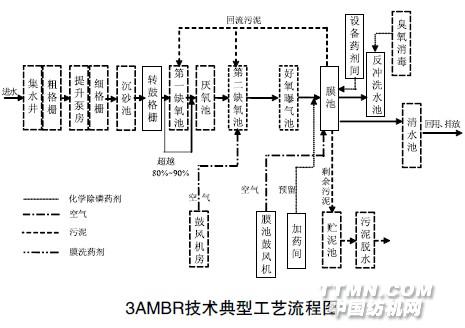 1 3AMBR技术特点及运行效果强化除磷脱氮膜生物反应器工艺(3AMBR工艺,Anoxic Anaerobic Aerobic -MBR 工艺)是将膜生物反应器技术与传统的厌氧、缺氧、好氧工艺结合的新工艺,使MBR工艺的突出特点与生物除磷脱氮过程相互促进,使整个系统除磷脱氮和去除有机物的效率达到最大化效果。3AMBR技术典型工艺流程见下图。