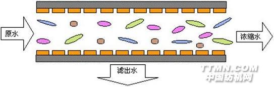 工作原理 一般认为MF的分离机理为筛分机理,膜的物理结构起决定作用。此外,吸附和电性能等因素对截留率也有影响。其有效分离范围为0.1-10μm的粒子,操作静压差为0.01-0.2MPa。微孔滤膜的截留机理因其结构上的差异而不尽相同。(a)在膜的表面层截留; (b)在膜内部的网络中截留微滤能截留0.1~1微米之间的颗粒,微滤膜允许大分子有机物和溶解性固体(无机盐)等通过,但能阻挡住悬浮物、细菌、部分病毒及大尺度的胶体的透过,微滤膜两侧的运行压差(有效推动力)一般为0.7bar。