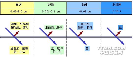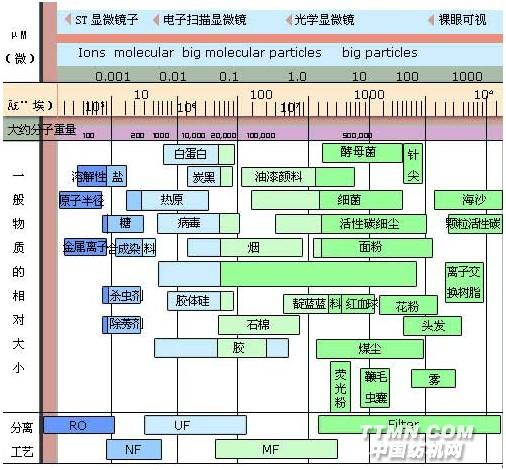 下图显示了水中各种杂质的大小和去除它们所使用的分离方法。反渗透主要用来去除水中溶解的无机盐;而超滤则可以去除病毒、大分子物质、胶体等;微滤一般能够去除水中的细菌、灰尘,具有很好的除浊效果。这些都是传统的过滤(如砂滤、多介质过滤等)无法实现的。.jpg)