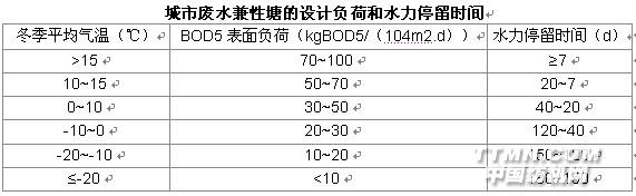 (1)设计方法:一般是采用经验方法进行计算,即BOD表面负荷法。BOD表面负荷与冬季平均气温有很大关系。下表是我国“七五”科技攻关成果对城市废水兼性塘建议的主要设计参数: