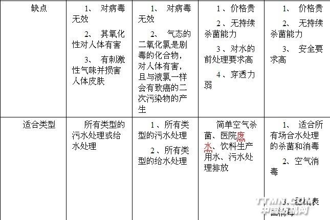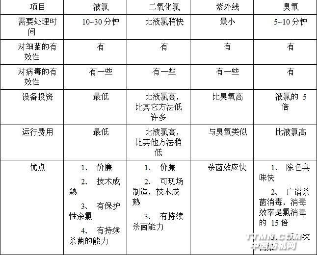 目前采用的消毒技术主要有:液氯、 臭氧、二氧化氯、紫外线。由于液氯消毒带来的二次污染、以及余氯对人体的刺激使得没有类似问题的其它消毒方法得到应用。其中,臭氧、紫外线和二氧化氯是新兴的最为重要的消毒方法。各种消毒杀菌方法的效果和优缺点的比较如表所示。.jpg)