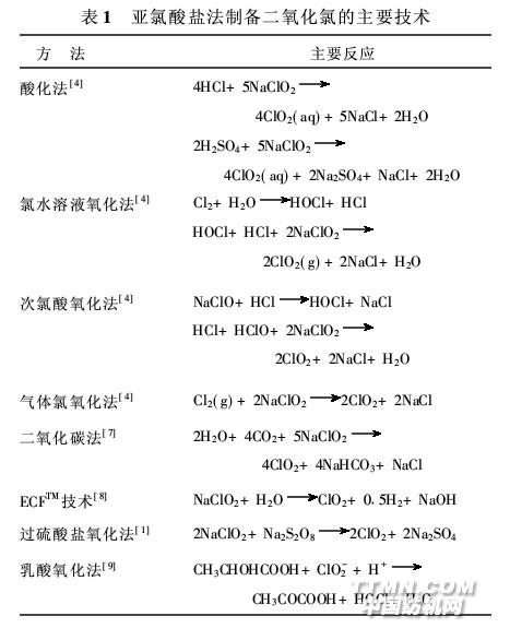1 亚氯酸盐法 该法以亚氯酸钠为主要原料,尽管价格昂贵,但在酸性等温和条件下极易释放出二氧化氯,因而广泛用于小型二氧化氯发生器中。目前,以亚氯酸钠为原料发生二氧化氯的方法主要有酸化法、氯气氧化法、过硫酸盐氧化法、二氧化碳法等,不同的方法化学反应方程式见表1。