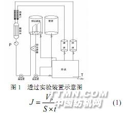 1 实验部分1.1 实验材料重铬酸钾(分析纯) ,天津市科密欧化学试剂开发中心;硝酸铬(分析纯) ,北京五七六零一化工厂;去离子水;纳滤膜由上海亚东核级树脂有限公司提供。1.2 实验装置与实验方法实验装置由浙江中控科教仪器设备有限公司生产。实验研究了纳滤膜对不同价态铬离子的截留性能,纳滤膜为复合材质,表层材料为聚芳香酰胺,支撑层为聚砜,膜面积为 0.4 m2。透过实验装置如图 1 所示,实验过程中控制温度恒定为25 ℃,操作压力为 0.30~0.55 MPa,溶液中铬离子浓度采用岛津 A-6300原子吸收分光光度计 (日本岛津公司)进行检测。1.3 膜通量和截留率膜通量(J)是用来表征膜组件工作能力的重要参数,计算公式如下: