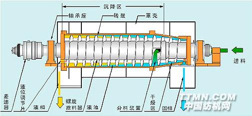 离心式污泥脱水机结构示意图 ④在离心机内,细小的污泥也能与水分离,所以絮凝剂的投加量较少,一般混合污泥脱水时的加药量为:1.5kg/t[干泥],污泥回收率为95%以上,脱水后泥饼的含水率为60%-85%左右,而带滤机由于滤带不能织得太密,为防止细小的污泥漏网,需投加较多的絮凝剂以使污泥形成较大絮团,一般混合污泥脱水时的加药量大于3kg/L[干泥],污泥回收率为90%以上,脱水后泥饼含水率80%左右;⑤离心机每立方米污泥脱水耗电为1kw/m3,运行时噪音为小于85db,全天24h连续运行滁停机外,运行中不需清洗水;而带机每立方米污泥脱水耗电为0.8kw/m3,运行时噪音为80db,滤布需松驰保养,一般每天只安排二班操作,运行过程中需不断用高压水冲洗滤布;⑥离心机占用空间小,安装调试简单,配套设备仅有加药和进出料输送机,整机全密封操作,车间环境好;而带机占地面积大,配套设备除加药和进出料输送机外,还需冲洗泵,空压机,污泥调理器等等,整机密封性差,高压清洗水雾和臭味污染环境,如管理不好,会造成泥浆四溢;⑦离心机易损件为轴承和密封件,卸料螺旋推料器的维修周期一般在3年以上,进口名牌轴承和密封件可保证设备长时间高强度运行,正常的保养后可大大延长维修周期;而