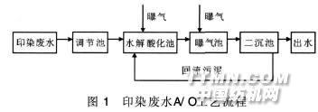 LSS较大,所以污水以泥水混合的形式流入曝气池。曝气池的HRT为8~10h,MLSS为5.1~6.8g/L,SV30约为89%,经竖流式二沉池沉降下来的污泥全部回流到水解酸化池,整个A/O工艺基本没有剩余污泥产生。从图1可以看出,水解酸化池并不是严格的厌氧段,它与传统理论上的水解酸化池有很大的不同。首先,填料上生长的厌氧菌起到厌氧作用,使大分子及难生物降解的物质转化为易于生物降解的小分子物质,提高了印染废水的可生化性;其次,加入微量曝气搅拌以及回流污泥,就会产生或带入好氧微生物,使水解酸化池又具有好氧生物处理作用,这样无形中增加了整个工艺好氧段的体积与时间。该企业印染废水水质见表1。2.2 监测结果分析与讨论