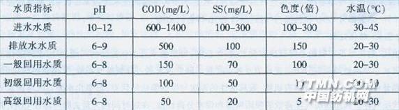 1 工程概况 浙江新建纺织有限公司是一家集织、染、印于一体的大型纺织印染股份制企业。2007年底,新建纺织投资建设日处理规模1500 m3的废水处理系统,对全厂的生产废水(包括染整、印花、织造、染丝等)和生活污水进行处理。依据2008年颁布的《印染行业准人条件》和印染废水再资源化的发展趋势,新建纺织提出如表1所示的废水处理和回用需求。其中,排放水执行当地纳管标准,回用水水质按其用途分三类回用。一般回用水用于厂区清洁以及碱回收冷却、退浆、氧漂、丝光等对水质要求不高的生产环节,初、高级回用用于印花和染色的关键工艺。表1 工程设计进出水水质指标
