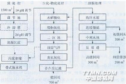 2 设计思路和工艺流程 在对现场条件和废水水样分析.参考印染废水工程案例.认为工程设计应当针对如下难点展开: (1)水质波动较大。印染工艺工序多,因此外排综合废水的水质和水量随工厂的订单差异及相关生产工艺的不同呈现较大差异。废水的pH值和毒性的大幅度波动将严重冲击生化系统,进水COD的大幅度波动也将影响出水水质。 (2)废水可生化性差。印染废水中含有具有生物毒性的有机染料分子和难生物降解的化学浆料造成BOD/COD的比值一般小于0.2。因此.直接进入好氧生化单元必将抑制其处理能力。 (3)废水色度高且难去除。由于印染工艺中大约10%左右染料进入废水,造成废水色度偏高。同时活性染料分子在废水中构成可溶性COD或者胶体颗粒.常规混凝和气浮等的物化方法难以去除。特别是还原性染料.在经过好氧曝气后才呈现色度。 根据上述分析.采用生化-物化二级膜工艺处理和回用新建纺织的印染废水,具体工艺流程如图l所示。