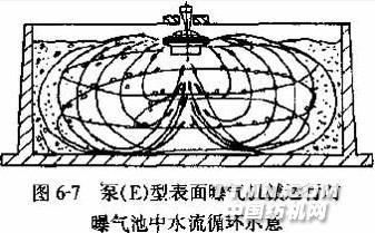 泵(E)型叶轮是我国自行研制的高效表面曝气叶轮。多年来广泛应用于石油化工、制革、印染、造纸、食品、农药和煤气等行业以及城市污水的生物处理。 图为泵(E)型表面曝气机叶轮运转时曝气池中水流循环示意。