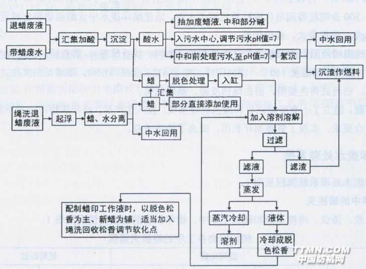 前言真蜡印花织物生产中,松香(蜡)用量极大。某印染厂月产真蜡印花织物600万m。其中,圆网印蜡织物400万m,平均每米印蜡1509,月耗蜡600t;辊筒印蜡织物200万m,平均每米印蜡2309,月耗蜡460t,两项合计月耗蜡l060t。一般,绳洗退蜡可回收利用50%的蜡,按此计算,月耗蜡仍需530t。以松香7 000融计,月耗资约370万元,每米印新蜡折合88g,平均每米耗蜡0.616元,成本较高。未能回收的500余吨松香则皂化成松香皂溶于水中,致使蜡印废水中含蜡溶物和含碱量高,CODcr值高达20 000mg/L,污泥量大,处理困难。此外,由绳洗退蜡所回收的旧蜡中含有大量杂质(如料、棉纤维等),若直接与新蜡混合配制蜡印工作液,印蜡时(圆网印蜡温度160℃,辊筒印蜡温度130℃)会沾污织物,退蜡后白度也达不到要求。若进行后续印花,沾污处得色萎暗,留白地白度差,品质低劣。针对上述问题,建立了一套废蜡回收和废水处理系统,投入生产后,蜡印织物白地品质和后续印花色泽鲜艳度均符合要求,实现了资源循环利用,提高了经济效益。1废蜡回收和废水处理系统废蜡回收和废水处理系统流程见图1。