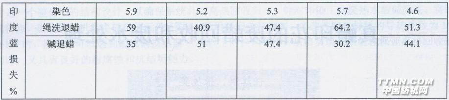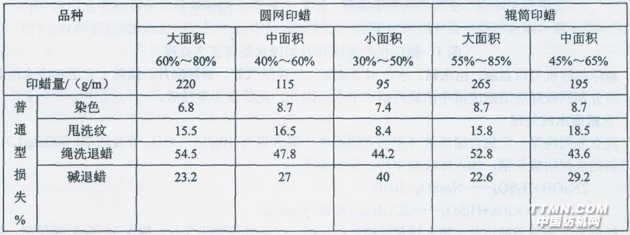 图1 蜡印生产废蜡回收和废水处理工艺流程1.1蜡印各工序中的蜡损失在染色、甩纹、染纹、绳洗退蜡和碱退工序中,蜡印织物的蜡损失情况见表1。表1蜡印织物各工序的蜡损失情况.jpg)