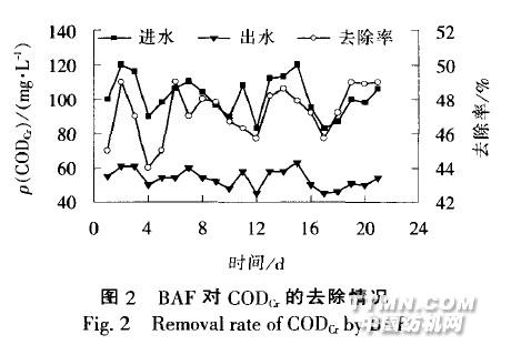 由图2可看出.在BAF稳定运行期问. 进水COD。的质量浓度为80~120 mg/L,平均值为100mg/L;出水CODcr的质量浓度为45~63 mg/L,平均值为55 mg/L;CODcr 去除率平均为46.8% 废水中COD cr主要是一些残余活性染料以及它们分解的中间产物.具有偶氮结构的活性染料在厌氧条件下将发色偶氮基团进行对称或非对称断键.分解成苯胺类物质.苯胺类物质对厌氧微生物具有毒性.在好氧条件下可生物降解:铜酞菁活性染料在厌氧条件下主要是被吸附去除.降解过程主要发生在好氧阶段:而蒽醌类活性染料无论在厌氧还是好氧条件下均难以生物降解.其去除过程主要是由生物吸附作用引起 尽管废水已经过生化处理。但仍含有偶氮染料分解的中间产物和铜酞菁染料.而蒽醌染料也可吸附去除。因而BAF对CODcr 的去除是仍然有效的。