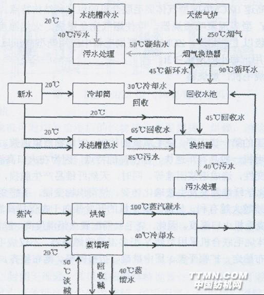 引言染整工厂在生产过程中会消耗大量的水和蒸汽,不但使企业的生产成本居高不下,而且还增加了社会的资源、能源负荷,加大了环境的治理压力。如何节水节能、降低成本、减少排放,是企业必须面对和解决的问题。我厂在近几年的生产管理中,依靠管理创新和技术改造,在节能减排方面取得了较好的成效,下面就对我厂近年来所做的节能减排的技术改造做一下简单的介绍。1计量仪表的安装改造及水、汽的量化管理1.1原来状况用水计量实现了二级计量管理,未实现三级计量管理;用汽计量还未实现全面的二级计量管理,部分二级管路没有计量。计量仪表不完备,缺少基础数据统计,难以实现指标细化管理、无法进行水热平衡和对比分析。1.2改造目的全面实现用水的三级计量管理和用汽的二级计量管理,建立日、周、月水汽耗用报表,对机台、班组的水汽能耗进行计量统计和指标考核;对工厂整体用水、用热进行综合的水热平衡分析。1.3成本投入加装水表、流量计及管路改造投入5万余元,加装汽表及管路改造投入13万元;成本投入共18万元。1、4实际效果水汽表及流量计加装改造完成后,实现了用水计量到机台的补水点,量化和稳定了水洗槽、喷淋等工艺补水量,为进一步研究降低工艺用水提供了条件;完善了机台、班组水汽指标的统计和考核,实现了水、汽消耗的量化管理;根据水汽耗用报表,可以对各机台进行冷、热水用量,可回收水量等进行统计分析,为整个工厂的水热平衡提供数据支持。2、水热平衡分析及技术改造方案制定2.1用水、用能要求及排放数据统计根据各机台用水温度要求和可回收情况,对用水、用能进行分类统计,汇总数据如下: