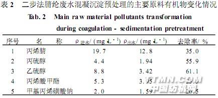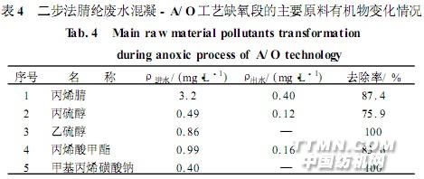 当各阶段反应均达到稳定状态后,分别取进出水进行色谱/质谱分析,具体方法及技术路线见文献[1]。分析数据采用HP定量软件自动积分检索处理。废水中所含的主要生产原料有机物丙烯腈、乙硫醇、丙硫醇、丙烯酸甲酯、甲基丙烯磺酸钠,因前四者为挥发性有机物,后者须作衍生化处理测定,故单独列出这五种化合物经各级处理后的变化情况。