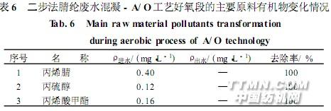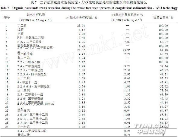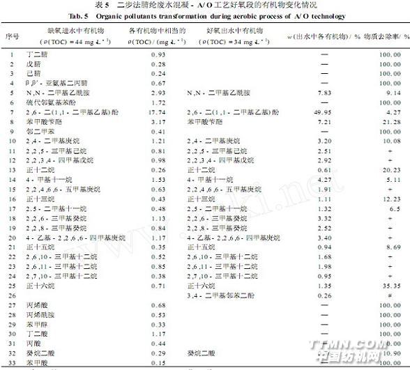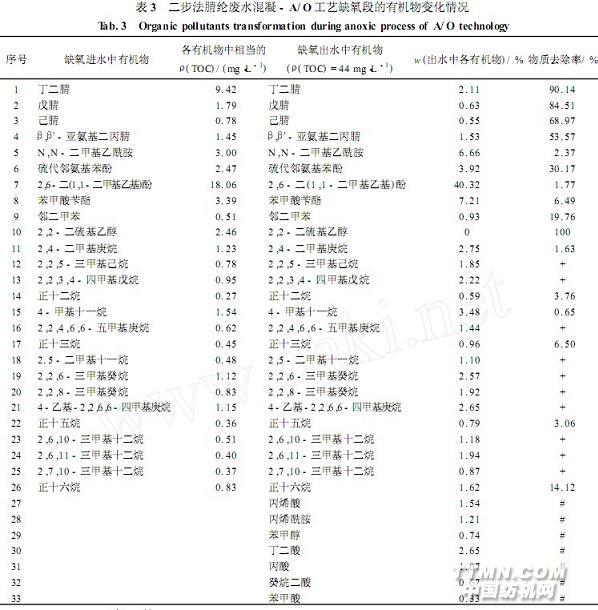 表5、6表明,废水经好氧段处理,缺氧段出水中所含的丙烯腈、丁二腈、戊腈、己腈、β,β′-亚氨基二丙腈、丙硫醇、丙烯酸甲酯、邻二甲苯、硫代邻氨基苯等均达到彻底去除,中间产物丙烯酰胺、丁二酸、苯甲醇、丙酸、丙烯酸、苯甲酸等亦降解完全,癸烷二酸有部分降解,3,4-二甲基邻苯二酚为新增物质。其它组分如正十二烷、正十三烷、正十五烷、正十六烷、4-甲基十一烷、2,5-二甲基十一烷、2,6-二(1,1-二甲基乙基)酚、N,N-二甲基乙酰胺及苯甲酸苄酯等继续有所降解,但降解率较低;其它侧链烷烃:壬烷异构体、十二烷异构体、十三烷异构体、十五烷异构体等仍无降解。好氧段出水中仅2,6-二(1,1-二甲基乙基)酚的质量分数就为49。95%,其次是N,N-二甲基乙酰胺、苯甲酸苄酯、烷烃类,这些均表现为难降解有机物。