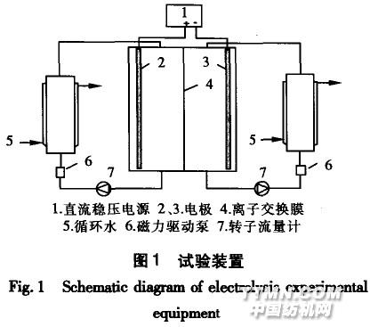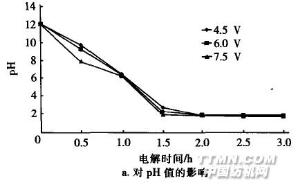 1.3 试验方法 .取废水和0.5% 的碱液各500 mL于夹套玻璃柱内,开启磁力驱动泵,设定循环水温度、槽电压、NaC1浓度,然后通电进行电解反应(设定电解时间为3 h),每隔0.5 h测定废水中COD、pH值的变化,确定工艺的最佳运行条件。1.4 分析项目及方法COD:微波消解快速测定法 ;pH值:pH计(pH213型,哈纳仪器);NaOH浓度:酸碱滴定法;PVA浓度:分光光度法 (752N型紫外/可.jpg)