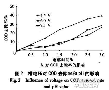 由图2(a)可以看出,在3种槽电压条件下,废水经1.5 h的电解后其pH值由12降至1.8左右,且随着电解时间的延长,pH值的变化较小。分析原因可能是废水中的阳离子(主要是Na )在电场力作用下逐渐通过膜迁移至阴极区,随着废水酸度的增加,H 代替Na 担负起离子迁移的任务,最终使生成的H 与迁移的H 数量一致,故pH值趋于恒定。由图2(b)可看出,槽电压对COD的去除具有重要影响,槽电压越高,对COD的去除率也就越高。2.2 氯化钠投量对预处理效果的影响
