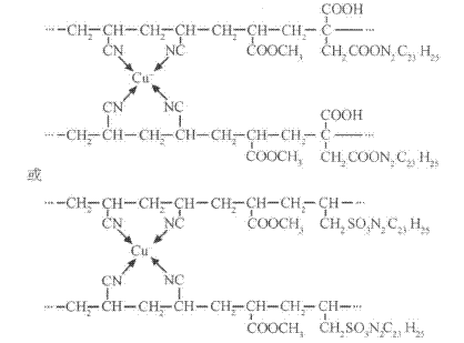 数生长期时用于实验。1.1.2 抗菌防臭纤维织物抗菌防臭纤维织物是江苏AB集团采用原中国纺织大学陈美华等开发的一种功能性的纤维织物,该纤维织物以腈纶纤维为第一单体,在腈纶纤维上复合亚铜离子,并以衣康酸或丙烯磺酸纳为第三单体,在其上复合碱性绿基团。由于铜离子和碱性绿基团均具有很强的抗菌、杀菌功能,其对金黄色葡萄球菌、大肠杆菌、枯草杆菌、白色葡萄球菌和白色念球菌等原核及真核细菌均有较强杀灭能力。其化学结构: