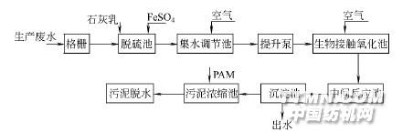 煮练、漂白及染色废水混合后,经格栅去除纤维和布条等杂质,再进入脱硫反应池,投加石灰乳和硫酸亚铁进行中和、脱硫、再用射流泵进行预曝气,兼具吹脱、搅拌、均质作用。氧化池进水量为20m3/h,采用射流器供氧。出水进入中间反应池,投加凝聚剂后进入快速固液分离器,清水溢流而出,根据水的色度大小,在溢流槽内适当添加次氯酸钠,除色消毒。污泥从底部排入干化场,干化场定期清理填埋。