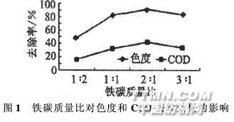 不同铁炭质量比对色度和COD去除率的影响见图1。由图1可以看出随着铁炭比的增加,COD去除率是先增加后减小,当铁炭比在2∶1附近时,色度和COD去除率达到最大。理论上来说,随着铁屑的加入,形成的铁炭微电极数量就会增加,内电解作用加剧,溶液中的Fe3+所产生的混凝作用也随之加剧,这两者的联合作用使得一开始脱色率和CODCr去除率急剧增加,由于本实验保持活性炭的总量不变,所以形成的微电极的数量是一定的,当铁炭比达到一定数值,铁炭微电极的数量达到最大值,而后再加入的铁屑对整个内电解反应的促进作用不会太明显,反而由于过多Fe2+以及染料的电解产物进入溶液中,使得样品的CODCr增加,CODCr去除率呈下降趋势;过多的Fe3+进入溶液中,使得溶液色度反而加深,脱色率也呈现出下降趋势。因此本实验选2∶1为最佳铁炭比。