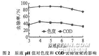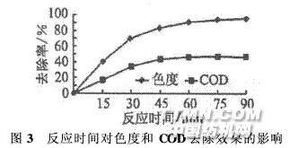 由图2可以看出,在酸性条件下处理效果优于碱性条件,但过酸的环境下处理效果也不理想。pH值太低,耗酸量增加,同时对铁屑的耗用、设备的腐蚀也增加。pH值低于4或者高于7处理效果会变差。因此最佳的反应pH值为4。从理论上分析可以发现在酸性条件下,铁屑的腐蚀加快,由电极反应生成具有很强活性的新生态的[H],可以破坏一些发色基团或是助色团的结构,使废水的色度降低;与此同时反应生成的Fe2+在出水时pH值呈中性或是碱性且有氧存在的条件下,可以形成Fe(OH)2直至Fe(OH)3,这样生成的絮状沉淀,通过吸附絮凝作用,将废水污染物去除。但酸性过强,会使处理后的水中