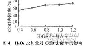 由图3可知,当内电解时间达到60min时,脱色率为91.30%,CODCr的去除率达到45.80%,此后再增加内电解处理时间,CODCr的去除率和脱色率都没有明显的增大。由此可确定最佳的内电解处理时间为60min。脱色率和CODCr去除率的升高是由2部分原因促成,主要是反应刚开始时活性炭对染料的吸附作用导致色度降低,脱色率、CODCr的去除率增高;另外,内电解作用破坏了一部分染料的偶氮发色基团,使得色度下降的同时破坏了染料较为稳定的共轭结构,染料的大分子结构被分解为小分子结构,当处理60min后,活性炭吸附基本达到饱和,脱色率和CODCr去除率变化变缓。上述实验确定的最佳参数为∶铁炭质量比2∶1,在进水pH=4的条件下,反应1h,取上层清液测定。实验结果表明,废水的可生化性(BOD/COD)由0.03增加到0.27,可生化性显著提高,为后续的生物处理创造了优良的条件。2.2 联合试验结果和讨论2.2.1 H2O2投加量的确定各取铁炭出水100mL,调节pH值至3,加入H2O2为0.4、0.6、0.8、1.0、1.2mL,调节pH值至8.5,加入0.1%PAM溶液。实验结果如图4所示。微电解反应结束后,废水中含有较多的Fe2+,与投加的H2O2反应形成Fenton试剂。H2O2与Fe2+反应,产生氧化性极强的OH·,OH·能氧化分解难降解的有机污染物,将大分子有机物断链为小分子或氧化分解为CO2和H2O,降低有机污染物的浓度。投加适量的H2O2时,在偏酸性的废水中就有更多的Fenton反应发生,如果H2O2投加过量,H2O2直接将Fe2+氧化成Fe3+,发生的并不是Fen-ton反应,以氧化还原为