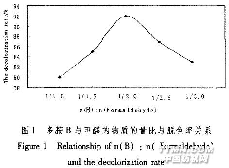 从图l知:当n(B):n(HCHO)从1:1.0降低到1:2.0时,脱色率提高;但当n(B):rl(HCHO)小于l:2.0时,多胺一甲醛树脂在水中的溶解速度变慢,导致处理后废水的脱色效果降低。从实验观察知,随着甲醛用量的提高,产品的黏度不断增加,产品稳定性降低,而且游离醛含量也会增加。由此所知,当B与HCHO物质的量比为1:2.0时,沉降速度、污泥体积、脱色率都达到最佳。2.2 多胺B与三聚氰胺的配比对产品性能的影响在其他相同条件下,考察了多胺B与三聚氰胺的投料比对产品性能的影响,见图2。