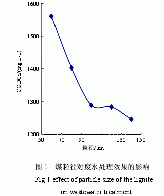 由图可以看出:随着煤粒径由大到小的变化,COD的值呈现由高到低的趋势,线性规律较明显,250μm到150μm,COD去除效果特别明显,150μm以下,差值不大。煤粒径越小,则颗粒比表面积越大,而且在弱碱性环境下,因褐煤中腐植酸被提取出,褐煤的孔隙率进一步增大,其表面能也随之进一步增大,其吸附能力也随之增强;另一方面,褐煤中含有丰富的腐植酸,腐植酸具有较好的絮凝功能,这两方面作用可以有效地吸附、絮凝印染废水中的染料组分,降低COD,使图中线性规律呈由高到低的趋势。但是,当粒径小于150μm时,由于一定质量的褐煤所含腐植酸的量是一定的,它不随粒径的大小而改变,而且,粒径越小,褐煤自身所含消耗COD的成份就越容易析出,这就决定了COD的去除量差别不太大这一特性。