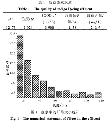 靛蓝染料主要用于牛仔布的染色。常州地区是全球主要的牛仔布生产基地,2004年全市牛仔布产量达到世界总量的20%,为城市贡献了7%的工业增加值。同时消耗了14%的工业新鲜用水,排放了18%的全常州市COD排放总量。我国印染行业与国外相比,单位产品耗水量是发达国家的2-3倍,排污总量是国外产品的1·2-1·8倍[1]。2008年1月1日起,江苏省要求太湖流域所有纺织印染企业执行《太湖地区城镇污水处理厂及重点工业行业主要水污染物排放限值》(DB32/T1072-2007),其中ρ(COD)≤60mg/L。因此,加快牛仔布生产过程污染排放核心控制技术的研发,不仅对我国从牛仔布生产大国向技术强国提升,而且对常州区域水环境质量改善与可持续发展,都有着非常重要的意义。牛仔布生产过程中的主要产污环节来自于经纱的靛蓝染色工艺,靛蓝染料对棉纤维仅有中等程度的直接上染性,10%的染料不能被纤维吸收,随工艺废水排放。回收染色工艺废水中的染料既有可观的经济效益,又可大幅度降低工艺废水中的COD浓度与色度,减少末端污染治理设施的运营费用,有较强的经济效益和社会效益。1 实验部分1·1 实验设备及试剂5B-1型COD快速测定仪,兰州连华环保科技有限公司;HJ-6型多头磁力搅拌器,金坛市恒丰仪器厂;雷磁PHS-3C精密pH计;生物显微镜;增氧泵EP-9000,创星电器有限公司。浓硫酸(98%),分析纯,国药集团化学试剂有限公司;工业级硫酸、氢氧化钠。废水取自常州某印染厂。1·2 实验步骤实验包括预处理靛蓝晶体再析絮凝回收3部分。靛蓝染色废水中含有隐色体靛蓝(还原态靛蓝)和氧化态靛蓝、反应剩余的保险粉和氢氧化钠、反应生成的硫酸钠和亚硫酸钠、染色助剂及棉细纤维等成分,为强碱性体系。废水中大量的棉细纤维,会影响靛蓝的回收效率及所回收靛蓝染料的