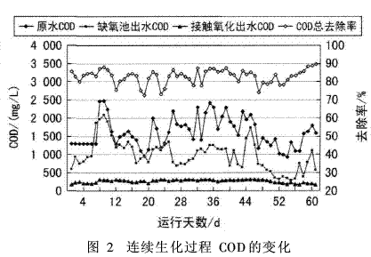 1.4 测试方法水质检测均按国家标准分析方法及国家环保局组织编写的《水和废水监测分析方法》(第四版)进行。2·结果与分析2.1 连续生化试验连续生化试验历时3个月,其中填料挂膜驯化期约30d,驯化稳定期可观察到粘附在填料上的生物膜结构密实、污泥絮体成球状。对生物接触氧化池内的填料进行显微镜观察,若发现有大量菌胶团存在,说明生物膜基本驯化成功,污泥沉降性能良好,可进行连续试验。试验结果见图2。