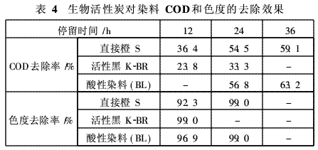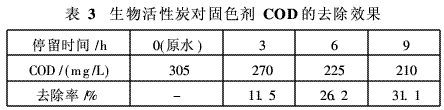 由图2可知,缺氧水解对丝绸印染废水COD具有一定的去除效果。进入稳定运行阶段后,进水COD为900~2500mg/L,废水经缺氧处理后,COD明显降低,再经生物接触氧化进一步处理,出水COD基本控制在300mg/L以下,平均去除率为82%,表明缺氧-接触氧化系统对废水COD 变化具有较好的适应性,能够适应丝绸印染废水COD波动大的特点。测定缺氧池进出水挥发性脂肪酸(VFA)发现,原水VFA为 0.6~0.7mmol/L,缺氧池出水VFA为1.1~1.4mmol/L,表明经缺氧处理后,部分高分子有机物已转化为分子量较小的有机酸组分,改善了印染废水的可生化性。2.2 混凝试验在相同条件下,聚合氯化铝对废水COD去除率为20%~30%,且受进水浓度的影响较小,混凝效果较为稳定。而氯化铁对COD的去除率为 10%~25%,但波动较大,因而确定采用聚合氯化铝作混凝剂。经混凝处理的生物接触氧化池出水COD仍大于100mg/L,不能满足排放标准,需要进一步处理。2.3 生物活性炭深度处理试验生物活性炭法处