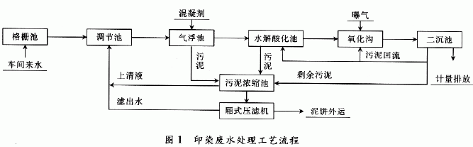 3主要处理构筑物3.1气浮装置对染厂原处理工艺中一套气浮装置进行改造,采用了溶气气浮工艺。采用的混凝剂是聚合氯化铝(PAC)。气浮系统在整个处理系统中作用明显,可以很好的去除印染废水中大量的油及表面活性剂,有效防止氧化沟表面形成泡沫层。该装置为一体化设备,规格为5m×3m×2.4m。3.2水解酸化池本设计水解酸化池的特点是在池内设有弹性填料。填料上的生物膜,把复杂难降解的大分子有机物水解成易降解的简单有机物,并可降低废水的SS浓度,降低废水的色度。池体设计规格为7.0m×10.0m×6.3m(填料层高度3.0m),停留时间为10h。3.3氧化沟本设计好氧工艺采用了四沟型Carrousel氧化沟,与二沉池合建。氧化沟水力停留时间和污泥龄较长,悬浮有机物可与溶解性有机物同时得到较彻底的去除,排出的剩余污泥已得到高度稳定,污泥不需要进行