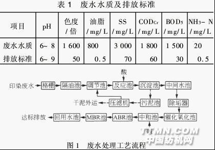 2 工艺说明及主要构筑物 (1)格栅。1座,砖混结构,尺寸3·2 m×1 m× 1·5 m,采用人工清除式格栅,栅条间距采用1 cm, 一天清理2次,以保证排水畅通。废水先经格栅去除大块杂物后,自流入隔油池。 (2)调节池。钢混结构,尺寸8 m×6 m×2.5 m, 1座,HRT 2.3 h。废水在调节池内一方面利用气 浮作用将油脂进一步除去,另一方面将废水充分混 合,均匀水质水量。 (3)沉淀池。钢混结构,尺寸5 m×5 m×3 m, 2座,HRT 3 h。加酸调pH到4左右,使废水中的油墨等大分子物质断链而释出,因废水中的释出物释出后能很快沉淀下来,因此,反应完全后进入沉淀池进行沉淀,沉淀池上清液进入中间池。 (4)催化氧化池。内设组合式催化氧化装置2 台,尺寸6 m×4 m×3 m,处理能力为25 m3/h,其关 键装置是一个管式催化氧化单元。管径采用200 (根据情况可大可小)的不锈钢管或PVC管,管内壁涂有光催化功能的TiO2
