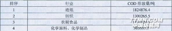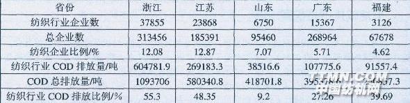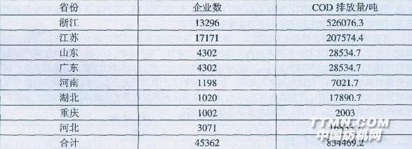 二、纺织行业主要问题 据全国第一次污染源普查,在39个行业中纺织行业排放COD量,已从第四位上升到第二位,全国39个行业共排放COD总量为7017081吨,纺织行业为1300265.5占18.53%。见表1;主要纺织大省排放量见表2;主要印染行业大省企业数及COD排放量见表3。 表1 主要行业COD排放量排序表.jpg)