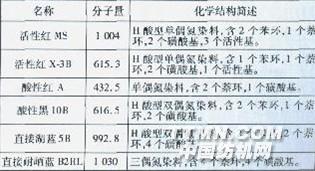 0 前言 水溶性偶氮染料是重要的纤维用染料,主要包括活性染料、酸性染料和直接染料等,具有种类繁多、色谱齐全、易于使用的特点,同时也被认为是印染废水的主要污染物之一,具有较高的生物毒性。对于印染废水的脱色处理,还原法具有脱色剂用量少、反应速度快和脱色率高等优点,十分适用于含有水溶性染料的染色废水的快速脱色。在水溶性阴离子偶氮染料还原脱色处理方面,近年来的研究发展较快,尽管有一些研究涉及偶氮染料的还原脱色反应,但是关于偶氮染料光还原脱色降解,特别是在辐射光影响方面鲜见报道。本试验以硼氢化物和硫酸盐混合物为还原脱色剂,对17个水溶性阴离子偶氮染料进行了脱色反应,重点考察了汞灯光辐射对其还原脱色反应的影响,并运用紫外可见光谱法对其进行分析。1 试验1.1染料与试剂 本研究共使用17个国产水溶性偶氮染料,其中活性染料包括活性红MS、活性红X-3B、活性红K2G、活性嫩黄X-7G和活性蓝B;酸性和中性染料包括酸性红A、酸性黑10B、酸性橙156、酸性媒介黑PV和中性黑172;直接染料包括直接桃红12B、直接湖蓝5B、直接耐晒蓝B2RL、直接深棕M、直接灰D、直接黄棕D-3G和直接枣红GB。活性红MS、活性红x-3B、酸性红A、酸性黑10B、直接湖蓝5B和直接耐晒蓝B2RL的名称和化学结构特征如表1所示;硼氢化钠、重亚硫酸钠等试剂均为分析纯。 表1偶氮染料的名称和化学结构特征