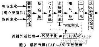 宁波某纺织有限公司采用的CAF系统是美国HydroCal环保公司专门为去除污水中的油脂与胶状物和固体悬浮物而设计的系统,其原理是通过独特的涡旋曝气机将微泡注入废水中,工艺流程见图3。