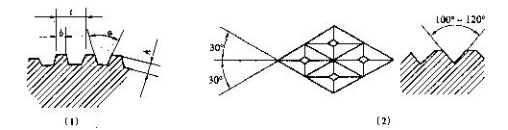 前后两列罗拉一般为沟槽罗拉,传动下皮圈的中罗拉为滚花罗拉。前后罗拉断面齿形如图7—2—2所示,图(1)为沟槽齿形罗拉,图(2)为滚花齿形罗拉。