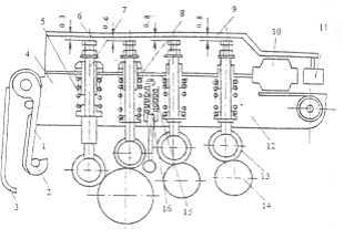 12-摇架支座13-后胶辊14-后罗拉15-压力棒加压弹簧16-压力棒加压芯轴