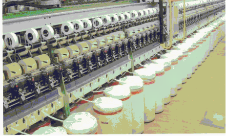 传统包芯纱可在普通改装过的细纱机上生产。首先在一般的细纱机上加装芯丝喂入机构和预牵伸机构。筒子长丝在导丝罗拉的牵引下退绕,不经过细纱机的牵伸机构,而是经过加装的预牵伸机构和V形槽导轮,自前罗拉皮辊后的集合器喂入,与牵伸后的须条合并,再通过前罗拉和导纱钩,由环锭回转加捻为长丝包芯纱。