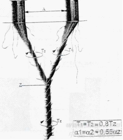因此,合股加捻力矩M由2Mf和须条力矩的垂直分量来平衡,即: