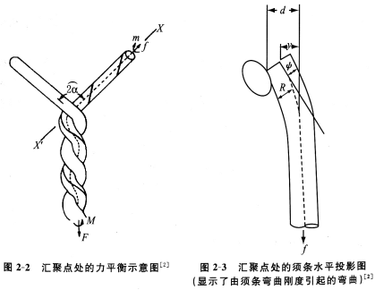 汇聚点位置(图2—2所示)由力和扭矩平衡决定。加捻产生的纺纱张力F和扭矩M与汇聚点以上作用在须条上的张力f和扭矩m达到平衡。